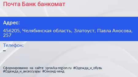 Почта Банк, банкомат по адресу 456205, Челябинская область, Златоуст, Павла Аносова, 257 в дальнейшем Организация, размещена в следующих категориях: