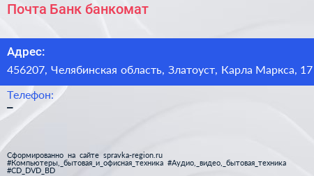 Почта Банк, банкомат по адресу 456207, Челябинская область, Златоуст, Карла Маркса, 17 в дальнейшем Организация, размещена в следующих категориях: