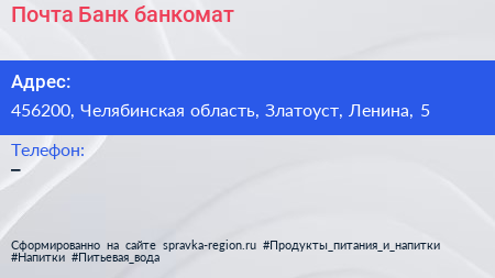 Почта Банк, банкомат по адресу 456200, Челябинская область, Златоуст, Ленина, 5 в дальнейшем Организация, размещена в следующих категориях: