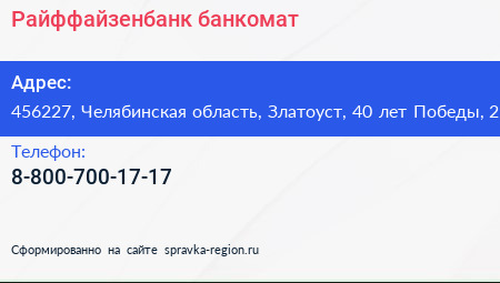 Райффайзенбанк, банкомат по адресу 456227, Челябинская область, Златоуст, 40 лет Победы, 2 в дальнейшем Организация, размещена в следующих категориях: