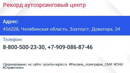 Рекорд, аутсорсинговый центр по адресу 456228, Челябинская область, Златоуст, Доватора, 24 в дальнейшем Организация, размещена в следующих категориях: