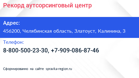 Рекорд, аутсорсинговый центр по адресу 456200, Челябинская область, Златоуст, Калинина, 3 в дальнейшем Организация, размещена в следующих категориях: