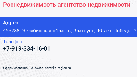 Роснедвижимость, агентство недвижимости по адресу 456238, Челябинская область, Златоуст, 40 лет Победы, 20 в дальнейшем Организация, размещена в следующих категориях:
