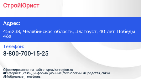 СтройЮрист по адресу 456238, Челябинская область, Златоуст, 40 лет Победы, 46а в дальнейшем Организация, размещена в следующих категориях:
