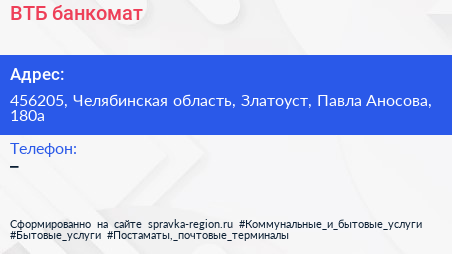 ВТБ, банкомат по адресу 456205, Челябинская область, Златоуст, Павла Аносова, 180а в дальнейшем Организация, размещена в следующих категориях: