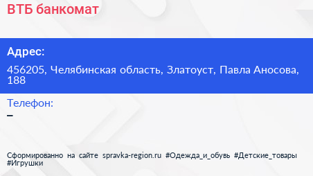 ВТБ, банкомат по адресу 456205, Челябинская область, Златоуст, Павла Аносова, 188 в дальнейшем Организация, размещена в следующих категориях: