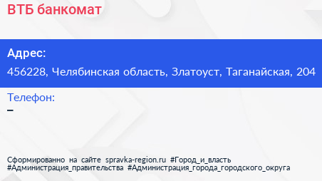 ВТБ, банкомат по адресу 456228, Челябинская область, Златоуст, Таганайская, 204 в дальнейшем Организация, размещена в следующих категориях: