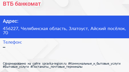 ВТБ, банкомат по адресу 456227, Челябинская область, Златоуст, Айский посёлок, 70 в дальнейшем Организация, размещена в следующих категориях: