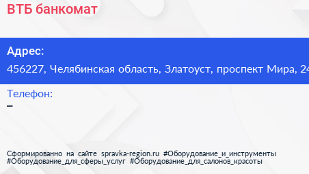 ВТБ, банкомат по адресу 456227, Челябинская область, Златоуст, проспект Мира, 24 в дальнейшем Организация, размещена в следующих категориях: