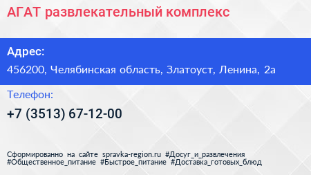 АГАТ, развлекательный комплекс по адресу 456200, Челябинская область, Златоуст, Ленина, 2а в дальнейшем Организация, размещена в следующих категориях: