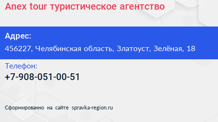 Anex tour, туристическое агентство по адресу 456227, Челябинская область, Златоуст, Зелёная, 18 в дальнейшем Организация, размещена в следующих категориях: