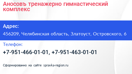 Аносовъ, тренажерно-гимнастический комплекс по адресу 456209, Челябинская область, Златоуст, Островского, 6 в дальнейшем Организация, размещена в следующих категориях:
