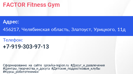 FACTOR Fitness Gym по адресу 456217, Челябинская область, Златоуст, Урицкого, 11д в дальнейшем Организация, размещена в следующих категориях: