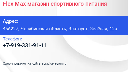 Fleх Max, магазин спортивного питания по адресу 456227, Челябинская область, Златоуст, Зелёная, 12а в дальнейшем Организация, размещена в следующих категориях: