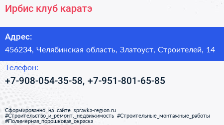 Ирбис, клуб каратэ по адресу 456234, Челябинская область, Златоуст, Строителей, 14 в дальнейшем Организация, размещена в следующих категориях: