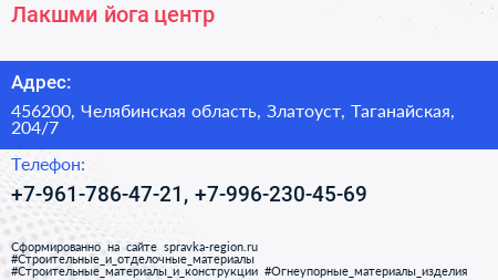 Лакшми, йога-центр по адресу 456200, Челябинская область, Златоуст, Таганайская, 204/7 в дальнейшем Организация, размещена в следующих категориях: