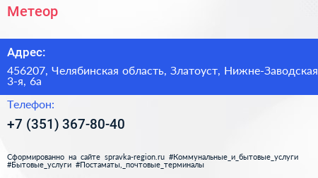 Метеор по адресу 456207, Челябинская область, Златоуст, Нижне-Заводская 3-я, 6а в дальнейшем Организация, размещена в следующих категориях: