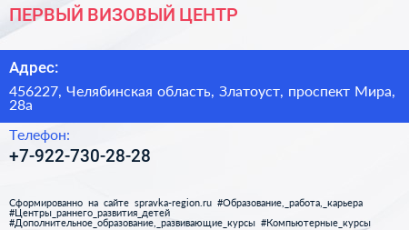 ПЕРВЫЙ ВИЗОВЫЙ ЦЕНТР по адресу 456227, Челябинская область, Златоуст, проспект Мира, 28а в дальнейшем Организация, размещена в следующих категориях: