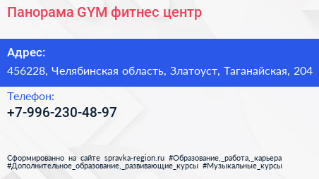 Панорама GYM, фитнес-центр по адресу 456228, Челябинская область, Златоуст, Таганайская, 204 в дальнейшем Организация, размещена в следующих категориях: