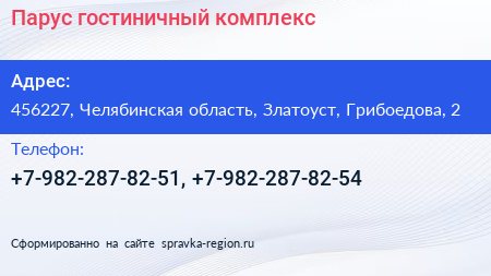 Парус, гостиничный комплекс по адресу 456227, Челябинская область, Златоуст, Грибоедова, 2 в дальнейшем Организация, размещена в следующих категориях: