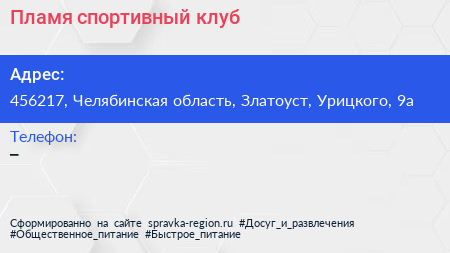 Пламя, спортивный клуб по адресу 456217, Челябинская область, Златоуст, Урицкого, 9а в дальнейшем Организация, размещена в следующих категориях: