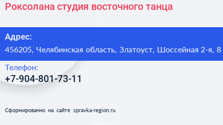 Роксолана, студия восточного танца по адресу 456205, Челябинская область, Златоуст, Шоссейная 2-я, 8 в дальнейшем Организация, размещена в следующих категориях: