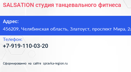 SALSATION, студия танцевального фитнеса по адресу 456209, Челябинская область, Златоуст, проспект Мира, 2а в дальнейшем Организация, размещена в следующих категориях: