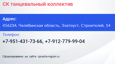 СК, танцевальный коллектив по адресу 456234, Челябинская область, Златоуст, Строителей, 14 в дальнейшем Организация, размещена в следующих категориях: