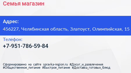 Семья, магазин по адресу 456227, Челябинская область, Златоуст, Олимпийская, 15 в дальнейшем Организация, размещена в следующих категориях: