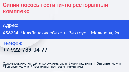 Синий лосось, гостинично-ресторанный комплекс по адресу 456234, Челябинская область, Златоуст, Мельнова, 2а в дальнейшем Организация, размещена в следующих категориях: