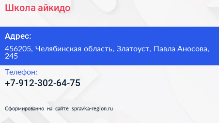 Школа айкидо по адресу 456205, Челябинская область, Златоуст, Павла Аносова, 245 в дальнейшем Организация, размещена в следующих категориях: