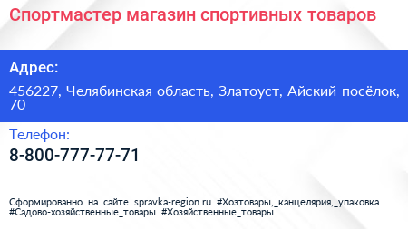 Спортмастер, магазин спортивных товаров по адресу 456227, Челябинская область, Златоуст, Айский посёлок, 70 в дальнейшем Организация, размещена в следующих категориях: