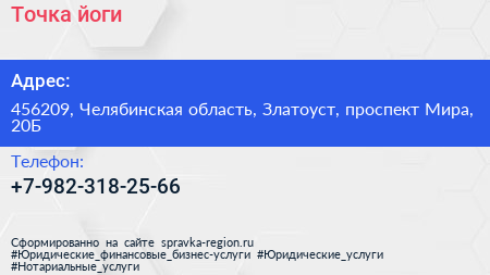 Точка йоги по адресу 456209, Челябинская область, Златоуст, проспект Мира, 20Б в дальнейшем Организация, размещена в следующих категориях: