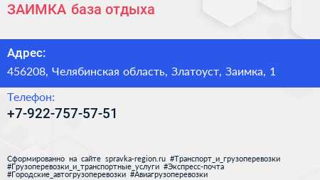 ЗАИМКА, база отдыха по адресу 456208, Челябинская область, Златоуст, Заимка, 1 в дальнейшем Организация, размещена в следующих категориях: