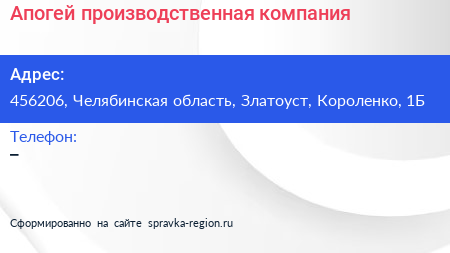 Апогей, производственная компания по адресу 456206, Челябинская область, Златоуст, Короленко, 1Б в дальнейшем Организация, размещена в следующих категориях: