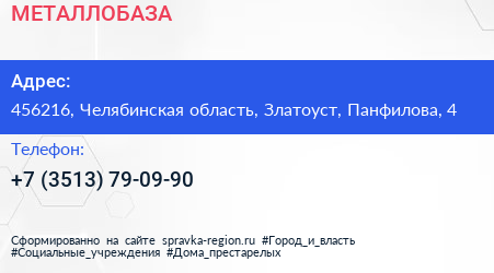 МЕТАЛЛОБАЗА по адресу 456216, Челябинская область, Златоуст, Панфилова, 4 в дальнейшем Организация, размещена в следующих категориях:
