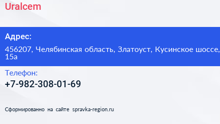 Uralcem по адресу 456207, Челябинская область, Златоуст, Кусинское шоссе, 15а в дальнейшем Организация, размещена в следующих категориях: