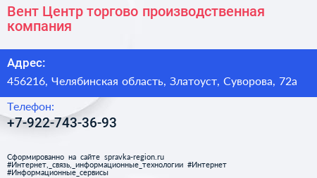 Вент-Центр, торгово-производственная компания по адресу 456216, Челябинская область, Златоуст, Суворова, 72а в дальнейшем Организация, размещена в следующих категориях: