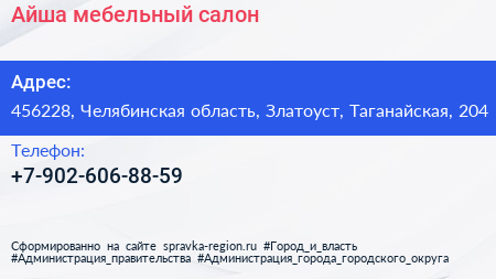 Айша, мебельный салон по адресу 456228, Челябинская область, Златоуст, Таганайская, 204 в дальнейшем Организация, размещена в следующих категориях: