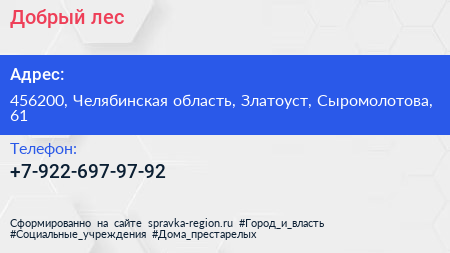 Добрый лес по адресу 456200, Челябинская область, Златоуст, Сыромолотова, 61 в дальнейшем Организация, размещена в следующих категориях: