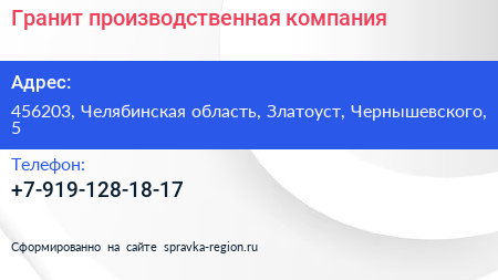 Гранит, производственная компания по адресу 456203, Челябинская область, Златоуст, Чернышевского, 5 в дальнейшем Организация, размещена в следующих категориях: