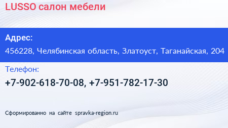LUSSO, салон мебели по адресу 456228, Челябинская область, Златоуст, Таганайская, 204 в дальнейшем Организация, размещена в следующих категориях: