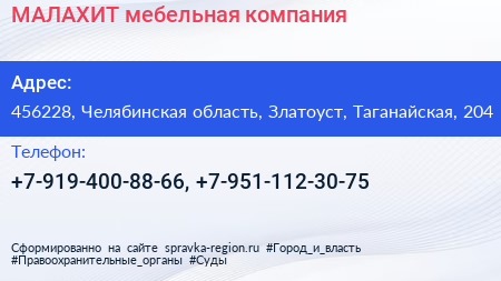 МАЛАХИТ, мебельная компания по адресу 456228, Челябинская область, Златоуст, Таганайская, 204 в дальнейшем Организация, размещена в следующих категориях: