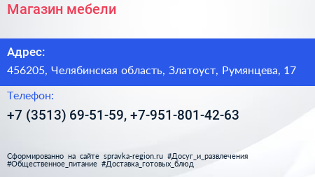 Магазин мебели по адресу 456205, Челябинская область, Златоуст, Румянцева, 17 в дальнейшем Организация, размещена в следующих категориях: