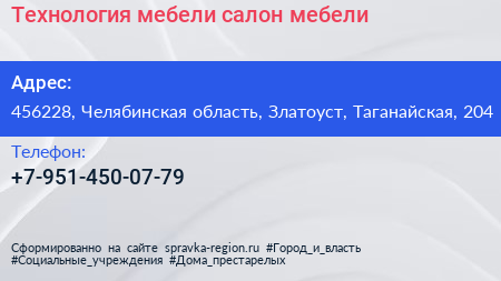 Технология мебели, салон мебели по адресу 456228, Челябинская область, Златоуст, Таганайская, 204 в дальнейшем Организация, размещена в следующих категориях: