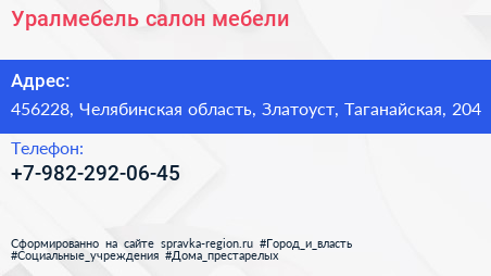 Уралмебель, салон мебели по адресу 456228, Челябинская область, Златоуст, Таганайская, 204 в дальнейшем Организация, размещена в следующих категориях: