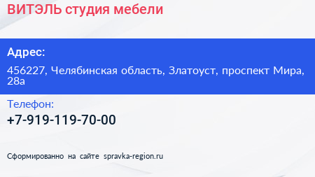 ВИТЭЛЬ, студия мебели по адресу 456227, Челябинская область, Златоуст, проспект Мира, 28а в дальнейшем Организация, размещена в следующих категориях: