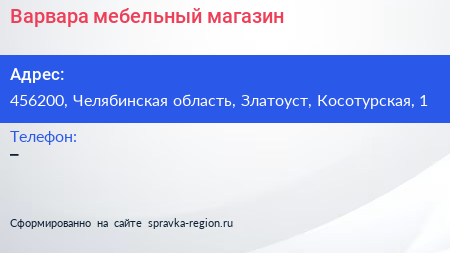 Варвара, мебельный магазин по адресу 456200, Челябинская область, Златоуст, Косотурская, 1 в дальнейшем Организация, размещена в следующих категориях:
