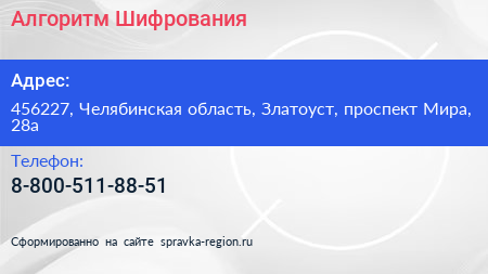 Алгоритм Шифрования по адресу 456227, Челябинская область, Златоуст, проспект Мира, 28а в дальнейшем Организация, размещена в следующих категориях: