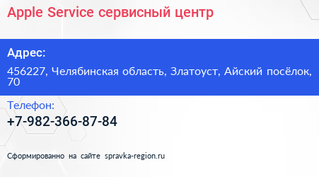 Apple Service, сервисный центр по адресу 456227, Челябинская область, Златоуст, Айский посёлок, 70 в дальнейшем Организация, размещена в следующих категориях: